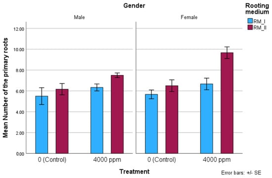 According to the results obtained with ANOVA, significant differences were found among RMs, gender, IBA treatment, and number of the primary roots. The RM composition xIBA pretreatment interaction significantly affected the rooting percentage. These results confirmed a strong relationship between the variables studied and the rooting capacity of the stem cuttings. Nevertheless, there were no significant differences in rooting percentages between RM xgender, and gender xIBA treatment (Table 3).