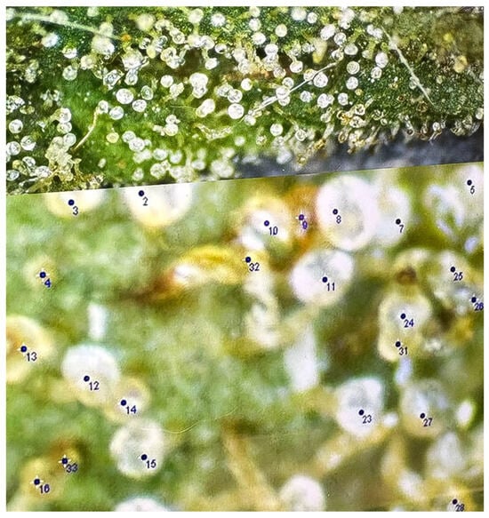 Trichome density counting on a cannabis bract using a digital microscope. The top panel displays a microscopic image of the cannabis bract, featuring glandular trichomes (clear, globular structures). The bottom panel illustrates the image after processing in ImageJ software 1.54p (ImageJ, U.S. National Institutes of Health, Bethesda, MD, USA, https://imagej.net/ij/), accessed on 14 November 2023.