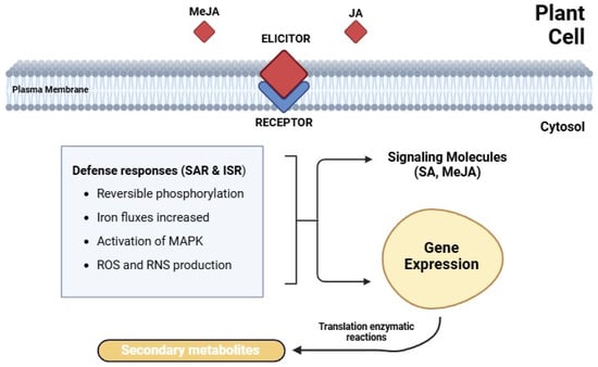 Methyl jasmonate (MeJA) and Jasmonic acid (JA) as elicitors of secondary metabolism: activation of defense responses and gene expression, leading to enhanced secondary metabolite production. Figure created using Biorender.com.