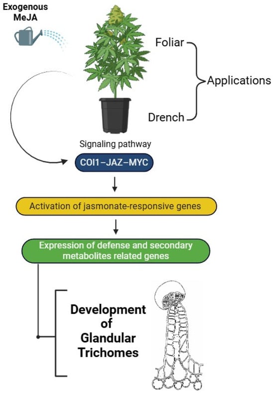 Exogenous methyl jasmonate (MeJA) induces the COI1–JAZ–MYC signaling pathway, leading to the activation of jasmonate-responsive genes, the expression of defense and secondary metabolism pathways, and the development of glandular trichomes in Cannabis sativa L. Figure created using Biorender.com.
