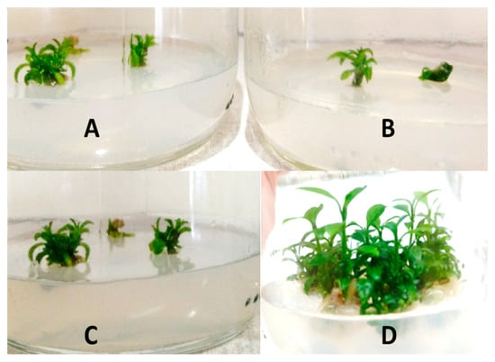 In vitro development of shoot apices (A,C) and nodal segments (B) of manacá-de-cheiro (Brunfelsia uniflora) after 30 days of cultivation and shoot proliferation after 90 days of cultivation in WPM medium containing 1.0 mg L−1 of BAP (D).
