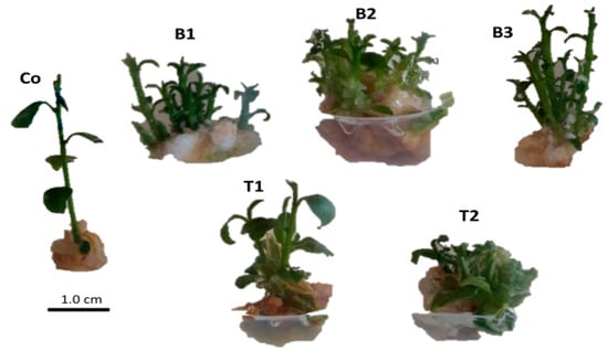 On the other hand, mainly in the presence of BAP (1.0–3.0 mg L−1), a considerable increase in the number of leaves per inoculated explant and shoot multiplication was observed, greater than 500% using 1.0 or 2.0 mg L−1 compared to the control (Figure 3B). This significant increase in the number of leaves was due to the development of multiple shoots in the explants (Figure 3 and Figure 2 B1–B3). However, the addition of BAP at high concentrations (>1.0 mg L−1) or TDZ at any concentration resulted in vitrification or hyperhydricity of the shoots, which reduced the quality of the shoots obtained in Brunfelsia (Figure 2 T1 and T2). Interestingly, shoots also formed callus at their bases in the control with no PGR addition (Figure 2 Co).