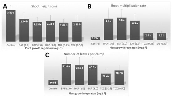 Plant growth regulators significantly affected (p < 0.01) plant height, shoot multi-plication rate and the number of leaves in in vitro shoots (Figure 2 and Figure 3). In the multiplication phase, there was no effect of the WPM [] and Murashige and Skoog [] ½ saline formulations on the analyzed variables. Adding BAP or TDZ to the culture medium reduced plant height by 2.14–2.30 cm, which differs from the control without plant growth regulators (3.23 cm) (Figure 2 and Figure 3).