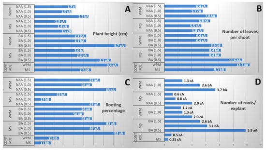 There was an effect of the interaction between the culture medium and auxins on plant height, number of leaves and roots, and percentage of rooting (Figure 4). In all treatments and the control without auxins, adventitious rooting of shoots from the multiplication phase (WPM + 0.5 mg L−1 BAP) was observed at different frequencies. Nonetheless, none of the tested treatments achieved 100% rooting of the shoots (Figure 4). Interestingly, the IBA resulted in a higher number of roots than NAA when using the MS ½ culture media, while NAA showed a better response than IBA when using the WPM culture media. This shows an interaction between the auxins and the formulation of the culture media. The use of MS ½ containing 0.5 mg L−1 IBA resulted in the best rooting percentage and number of roots/explant (Figure 4). For shoot development, WPM without auxins or containing IBA at 0.5 mg L−1 resulted in best plant height and number of leaves per shoot (Figure 4; Figure 5A,B). Furthermore, the lowest rooting percentages (16.7–25.0%) were observed in the control using both media and in the treatment of MS ½ containing 1.0–1.5 mg L−1 NAA.
