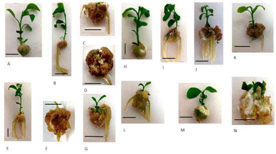 Development of shoot/calli/roots among treatments with culture media and auxins indole-3-butyric acid (IBA) and 1-naphthaleneacetic acid (NAA): (A) WPM control without auxins; WPM containing IBA at 0.5 mg L−1 (B), 1.0 mg L−1 (C) and 1.5 mg L−1 (D); WPM containing NAA at 0.5 mg L−1 (E), 1.0 mg L−1 (F) and 1.5 mg L−1 (G); MS ½ control without auxins (H); MS ½ containing IBA at 0.5 mg L−1 (I), 1.0 mg L−1 (J) and 1.5 mg L−1 (K); MS ½ containing NAA at 0.5 mg L−1 (L), 1.0 mg L−1 (M), and 1.5 mg L−1 (N). Scale bars = 1 cm.