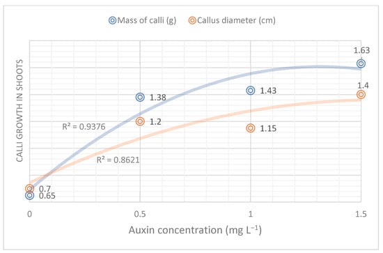 The increased frequency and intensity of callogenesis in explants during the rooting phase further supports this hypothesis because synthetic auxins, at higher concentrations, similar to those added to the culture medium, are known to increase ethylene biosynthesis in plants [].