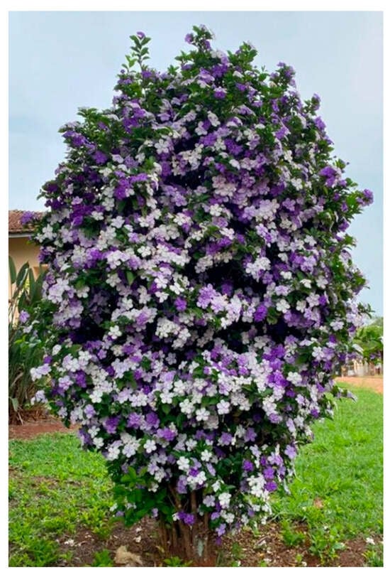 Brunfelsia uniflora (Pohl) D. Don, commonly known as ‘manacá-de-cheiro’, is a species native to Brazil, belonging to the family Solanaceae and found throughout South America []. This shrub has simple, alternate leaves [] and shows great potential as a potted flower or landscaping shrub, especially because of its flowers, which change from white to lilac and emit a sweet aroma, characteristic of this species.