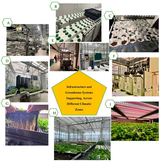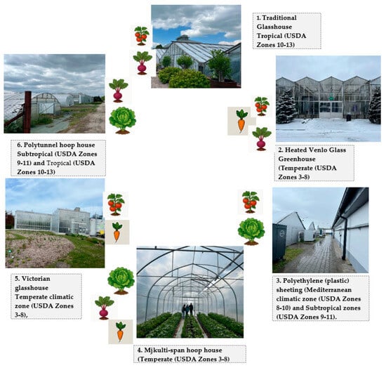 Despite advances, comprehensive studies comparing microclimatic effects across crops and climatic zones are scarce, limiting tailored greenhouse management strategies []. Various advanced approaches and technology-based equipment have revolutionized greenhouse production by enhancing environmental control, resource efficiency, and crop productivity (Figure 1). This review evaluates optimal microclimatic conditions for lettuce, tomatoes, carrots, beets, and radishes across temperate, subtropical, and arid zones. By analyzing growth, physiological responses (e.g., photosynthesis, transpiration), and biochemical profiles (e.g., antioxidants, sugars), it provides evidence-based recommendations for sustainable greenhouse practices []. These insights aim to enhance crop yield, quality, and resource efficiency, supporting global food security and agricultural resilience amid climate change. Future research should focus on integrated, multi-crop studies to develop adaptive technologies, benefiting growers and strengthening the food economy.