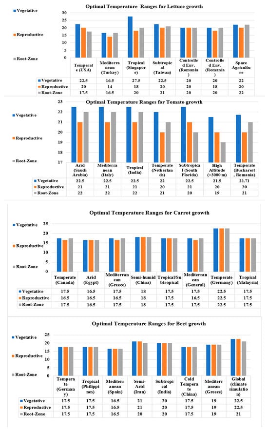 Comparative overview of optimal temperature ranges across diverse climatic zones for key greenhouse crops, including lettuce (Lactuca sativa L.), tomatoes (Solanum lycopersicum L.), beetroot (Beta vulgaris L.), and carrots (Daucus carota L.), highlighting temperature-dependent variations in crop performance.