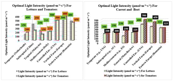 The present study has also found a wide range of light intensities (μmol·m−2·s−1) across different climatic zones and greenhouse settings, highlighting the significant variability in how crops such as lettuce, tomatoes, carrots, and beetroot respond to temperature fluctuations. These differences emphasize the importance of region-specific temperature management strategies to optimize growth, yield, and quality in controlled environments (Figure 4).