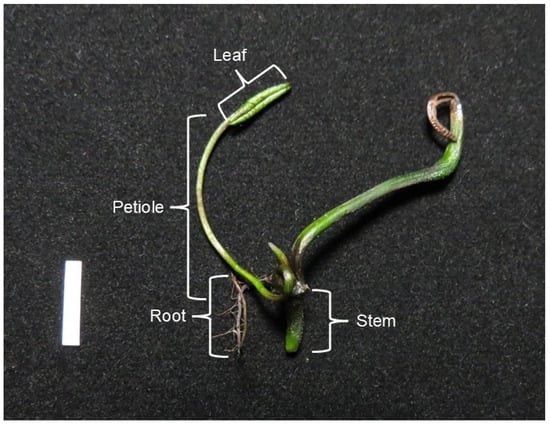 All experiments were designed using a completely randomized design (CRD), which contained 10 replicates in each treatment. The means of each parameter tested (leaf length, leaf numbers, petiole length, root length, and root numbers) were compared using a one-way analysis of variance (ANOVA), followed by Duncan’s multiple range test (DMRT) at a significance level of p ≤ 0.05. Statistical analysis was performed using SPSS® statistics software version 26.0 (IBM Corporation, Armonk, NY, USA).