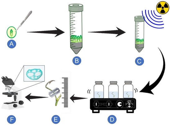 Conceptual diagram of the study of anatomical investigation of gamma irradiated lotus seedling (Nelumbo nucifera Gaertn.). (A) Embryos were isolated from flamed fruit. (B) Lotus embryos were cultured on solidified basal medium (BMS; Murashige and Skoog medium (1962)) supplemented with 2 mg L−1 of 6-Benzylaminopurine (BAP) for 7 days. (C) Lotus seedlings (M1V0) were acute gamma irradiation at 0–1100 Gy. (D) Gamma irradiated lotus seedlings (M1V1) were transferred into liquefied BMS medium for 30 days on 120 rpm orbital agitator. (E) Morphological and anatomical alteration investigations were observed. (F) Anatomical alteration affected by gamma irradiation observed under a microscope.