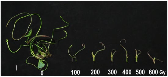 Morphology of lotus seedling after exposure to acute gamma irradiation at 0–600 Gy. Scale bar = 1 cm.