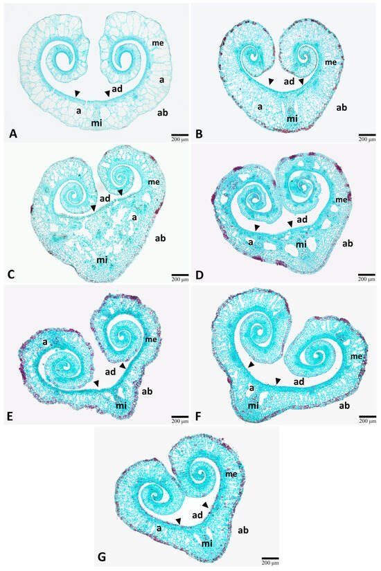 As the leaf blades were still in the early stage, they remained curled inward, resulting in a heart-shaped appearance when sectioned transversely (Figure 4). The epidermal cells of the adaxial side formed papillae (Figure 4A–G, arrowheads). The mesophyll was not distinctly differentiated into palisade and spongy parenchyma layers. Aerenchyma was predominantly observed, with extensive air spaces extending through the mesophyll. According to the comparative anatomy, the results showed no significant differences in the midrib diameter between treatments (Table 2). Moreover, tannins were prominent in the leaf blade, appearing as red to dark red cells due to safranin staining. Quantitative anatomical analysis showed that no tannin accumulation was detected in the epidermis of the leaf blade of control plants (0 Gy) (Figure 4A), whereas all treated plants exhibited tannin accumulation in the epidermis (Figure 4B–G).