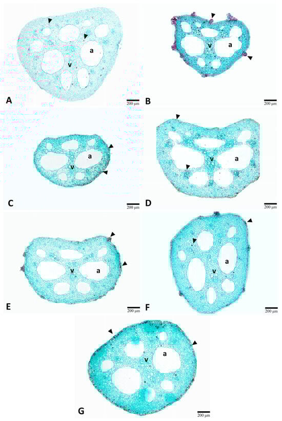 Stems were usually round in shape (Figure 6). Vascular bundles were irregularly distributed and embedded in the parenchymatous tissue. Extensive air spaces were radially arranged, and tannins were distributed throughout the cross-section of all treatments (Figure 6A–G, arrowheads). Stem diameter displayed the most pronounced stimulatory response to low-dose irradiation. The 100 Gy treatment produced the maximum diameter, representing a 30% increase over the control (Table 2). Meanwhile, higher doses (200–600 Gy) showed a gradual decline (Table 2).