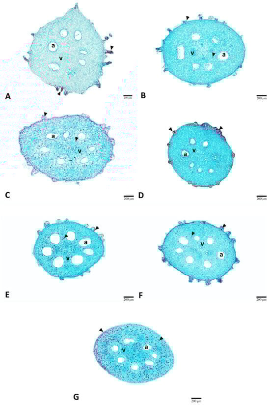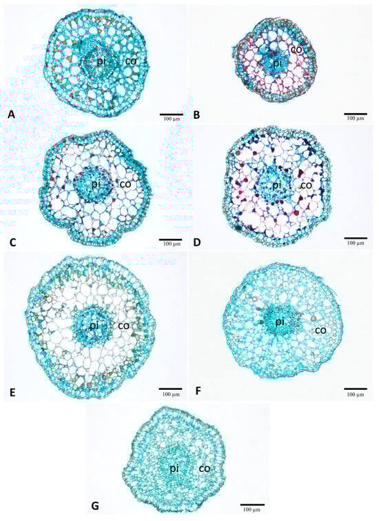 The roots were almost round in shape (Figure 7). Parenchyma served as the primary ground tissue, while aerenchyma was also present throughout the cortical zone of roots (Figure 7). Tannins were detected in the epidermis and some parenchyma in the cortex and pith of all treatments (Figure 7A–G). According to comparative anatomy, root diameter showed a different pattern compared to the petioles. The 100 Gy treatment resulted in a significant reduction compared with the control (0 Gy). However, doses from 200 to 500 Gy showed a progressive increase, reaching the maximum at 500 Gy, before decreasing again at 600 Gy (Table 2).