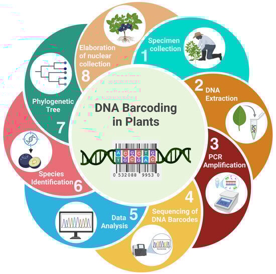 DNA barcoding has also emerged as a highly effective tool for the identification of native blueberry species, especially in regions such as the Peruvian Andes where many taxa are cryptic or poorly described [37]. This technique uses conserved DNA sequences (e.g., rbcL, matK, ITS) to assign reliable taxonomic identities, even at early phenological stages or from degraded samples [45]. Figure 2 illustrates the DNA barcoding concept and its application in species delimitation within Vaccinium spp.