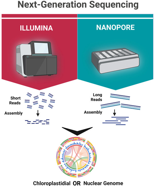 Next-generation sequencing technologies applied to plant genome assembly: comparison between short-read and long-read platforms for chloroplast and nuclear genome studies in Vaccinium spp. Short-read platforms (e.g., Illumina) offer high accuracy for base calling and are ideal for variant detection and small genome assembly. Long-read technologies (e.g., Nanopore) enable the resolution of repetitive regions, structural variants, and full-length genome assembly with fewer contigs, which is critical for reconstructing complex organellar and nuclear genomes.