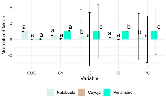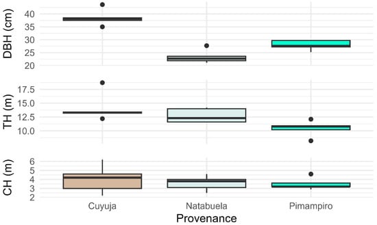 Trees from the Cuyuja provenance exhibited the highest mean values for diameter at breast height (DBH), total height (TH), and commercial height (CH) among the evaluated sites (Figure 2). These superior growth patterns are likely driven by favorable climatic conditions in Cuyuja, notably higher annual precipitation (1750–2000 mm) and lower mean temperatures (10 °C), which enhance water availability and reduce thermal stress, thereby supporting the vigorous growth of Juglans neotropica. Moreover, the natural regeneration ecosystem at Cuyuja likely maintains greater genetic heterogeneity and competitive interactions that promote adaptive vigor in selected individuals.