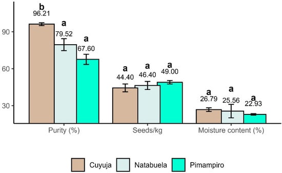 Comparison of seed physical purity, moisture content, and density among provenances of Juglans neotropica. Different letters (a, b) indicate statistically significant differences among provenances (p < 0.05) according to Tukey’s HSD test.