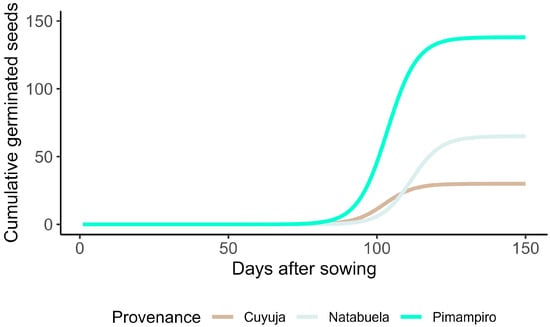 To illustrate the temporal dynamics of germination, cumulative germination curves were constructed for each provenance based on daily emergence records. The curves were plotted on standardized axes using the total number of seeds per provenance as the reference. Visualization was performed using the ggplot2 package in R version 4.1.0, applying a logistic smoothing function to improve interpretability while preserving the empirical structure of the data.