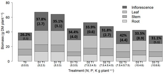 | Nutrient | Rate (g Plant−1) | Root | CV | Stem | CV | Leaf | CV | Inflorescence | CV |