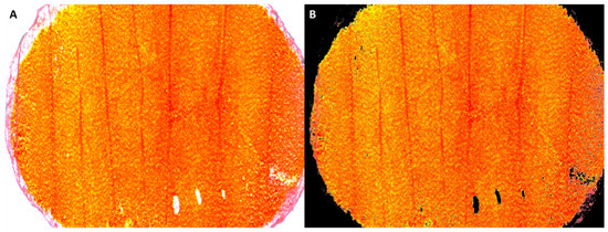 An example of the original microscopic image of a petal disc (A) and its processed version (B) after segmentation using the thresholding technique in ImageJ. The mean red, green, and blue color intensities of the image are estimated based on the corresponding values of all the non-black pixels of the figure.