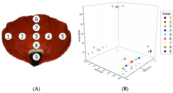 The analysis also showed that, as we move towards the base of the petal (i.e., areas 8 and 9), the blue color intensity increases, while the dark spot at the base displays the lowest red color intensity and the highest blue and green color intensities compared with the rest of the sampled areas (Figure 2B).
