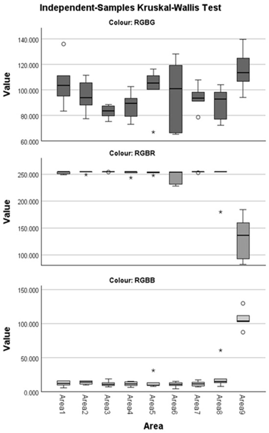 Friedman’s Test showed that, overall, the distributions of the individual RGB channel values differ significantly between the measurement areas (pRGBB = 0.016, pRGBG = 0.025, and pRGBR = 0.019, Table 1). The multiple comparisons procedure (Table 2) indicates that for the distributions of the RGBB and RGBR channels, Area 9 differs significantly from all other areas which do not differ between them (except RGBR Areas 9 and 5 and RGBB Areas 9 and 8, which appear to be the same, albeit marginally so, adjusted p = 0.063 for each subset). Regarding channel RGBG, only Areas 3 and 9 seem to be different.