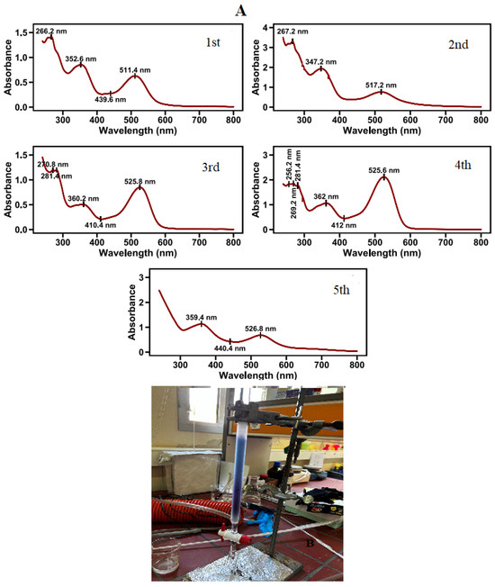 Five pigments were separated with column chromatography from the red areas of poppy petals (Figure 4). The most abundant pigment is the one eluted fourth. Cyanidin glucosides are in greater proportion in the pigment mixture [32]. The positions of UV and visible wavelength maxima (λmaxUV and λmaxVis, respectively) and the ratio of A440 to AmaxVis, absorbance are presented in Table 3.