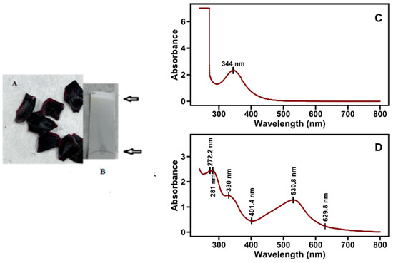 UV–vis spectrum (up) (A,B) and (C,D) spectrum (bottom) of petals’ red (left) and black (right) zones of the respective extracts in 70:30 ethanol–water solvent mixture.