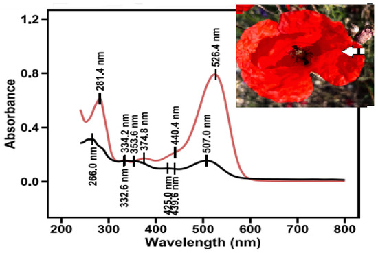 Flavonols have a dual function in the red poppy flower due to their antioxidant and UV-screening functions, which make them critical for plant adaptation to climate change, especially in the Mediterranean area [48,55,56]. Extraordinary absorption maxima in the UV region at 340–360 nm were detected in the eluted pigments from the red petal extract. Red petal segments indicate a case of flavonols covalently attached to anthocyanin molecules. Instead, in the spectra of anthocyanin in black spot, the UV max is located at 330 nm, indicating aromatic acylation. A UV pattern is observed with fluctuations in UV maxima between the red petals and the black spot area. Similar findings have been previously reported for the blue flowers of Agapanthus, where both types of co-pigment agents, an aromatic acyl group and a flavonoid co-pigment, are attached covalently to the anthocyanin [36]. It has been hypothesized that noncovalent (supramolecular) forces appear between covalent anthocyanin–flavonol complexes and were presumed to maintain a stable intramolecular association between anthocyanin and flavonol units, similar to those observed between anthocyanin and hydroxycinnamic acid residues in polyacylated anthocyanins [48].