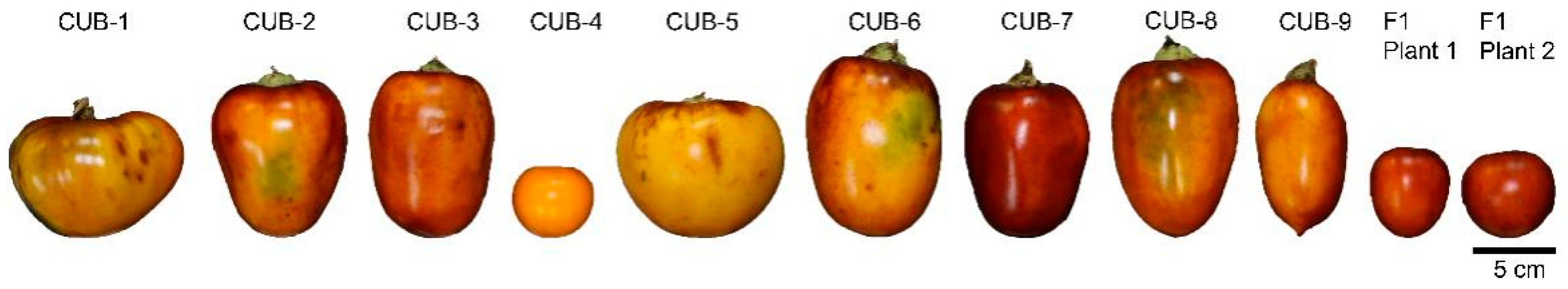 - Pizzinato, J.R.; Schuelter, A.R.; do Amaral Júnior, A.T.; de Souza Rocha, A.C.; da Siva, J.M.; Volkweis, C.R.; de Freitas, M.B.; Ricardo, F.; Schwantes, D.O. Crossing and diagnostic methods of cubiu hybrid plants based on genetic markers. Crop Breed. Appl. Biot. 2008, 8, 283–290. [Google Scholar] [CrossRef]
