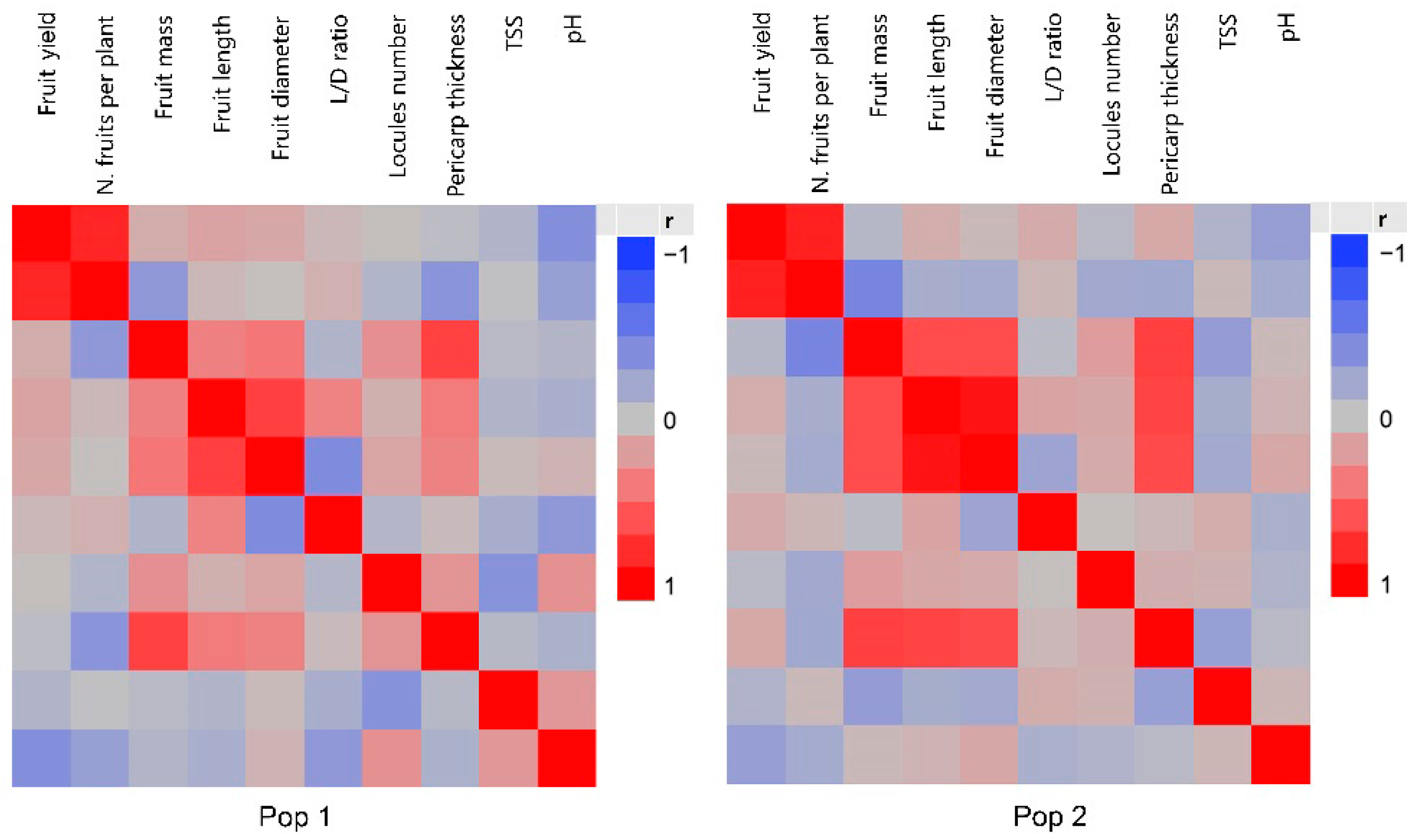 | Plant | Code | Fruit Yield (t ha−1) | Fruit Number per Plant | Fruit Mass (g) | Fruit Length (L) (cm) | Fruit Diameter (D) (cm) | L/D Ratio | Locule Number | Pericarp Thickness (mm) | Total Soluble Solids (Brix) | pH |
