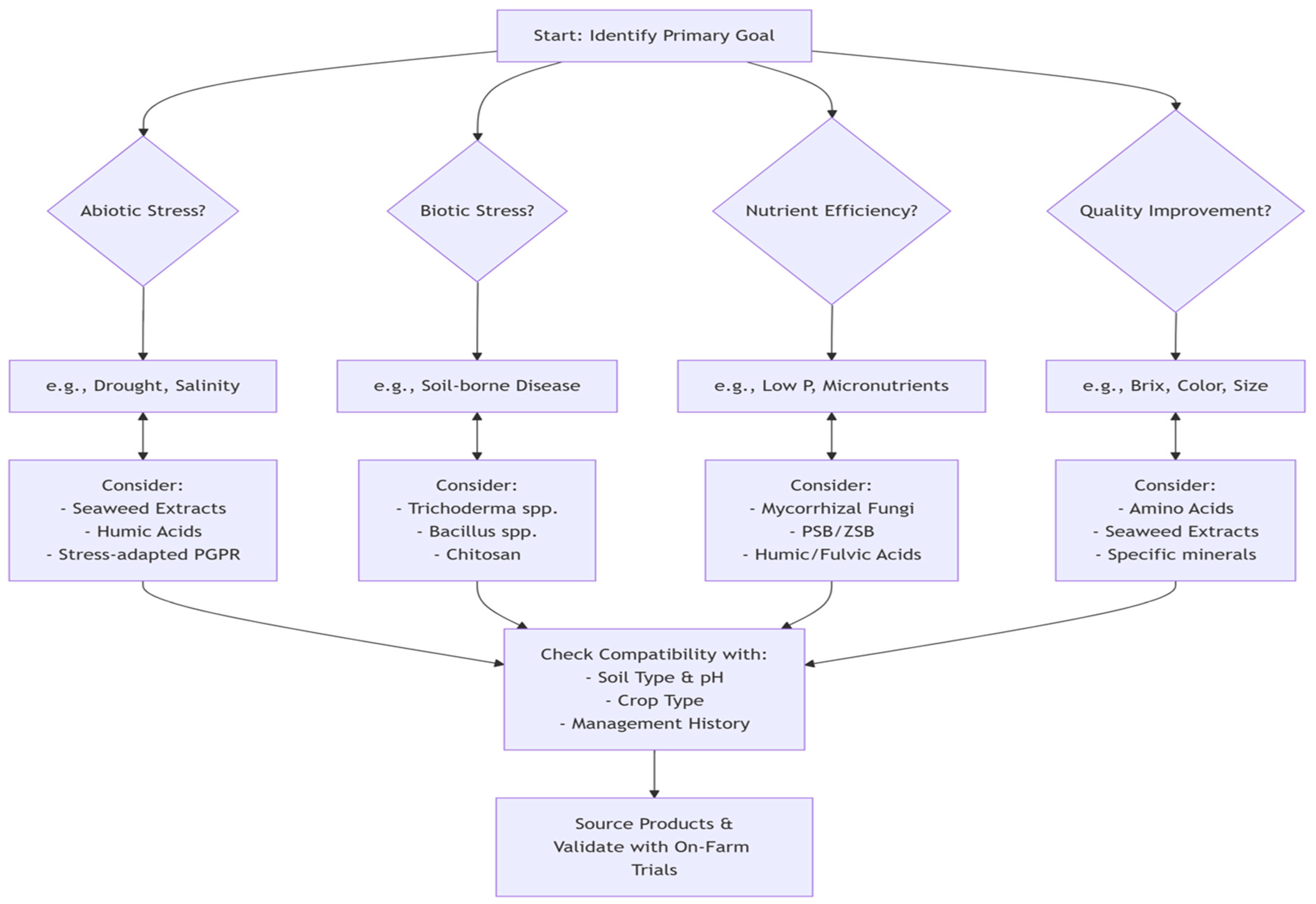 | Vegetables | Soil diseases, transplant shock, quality | Trichoderma, AMF, Seaweed extracts | Soil incorporation, foliar |