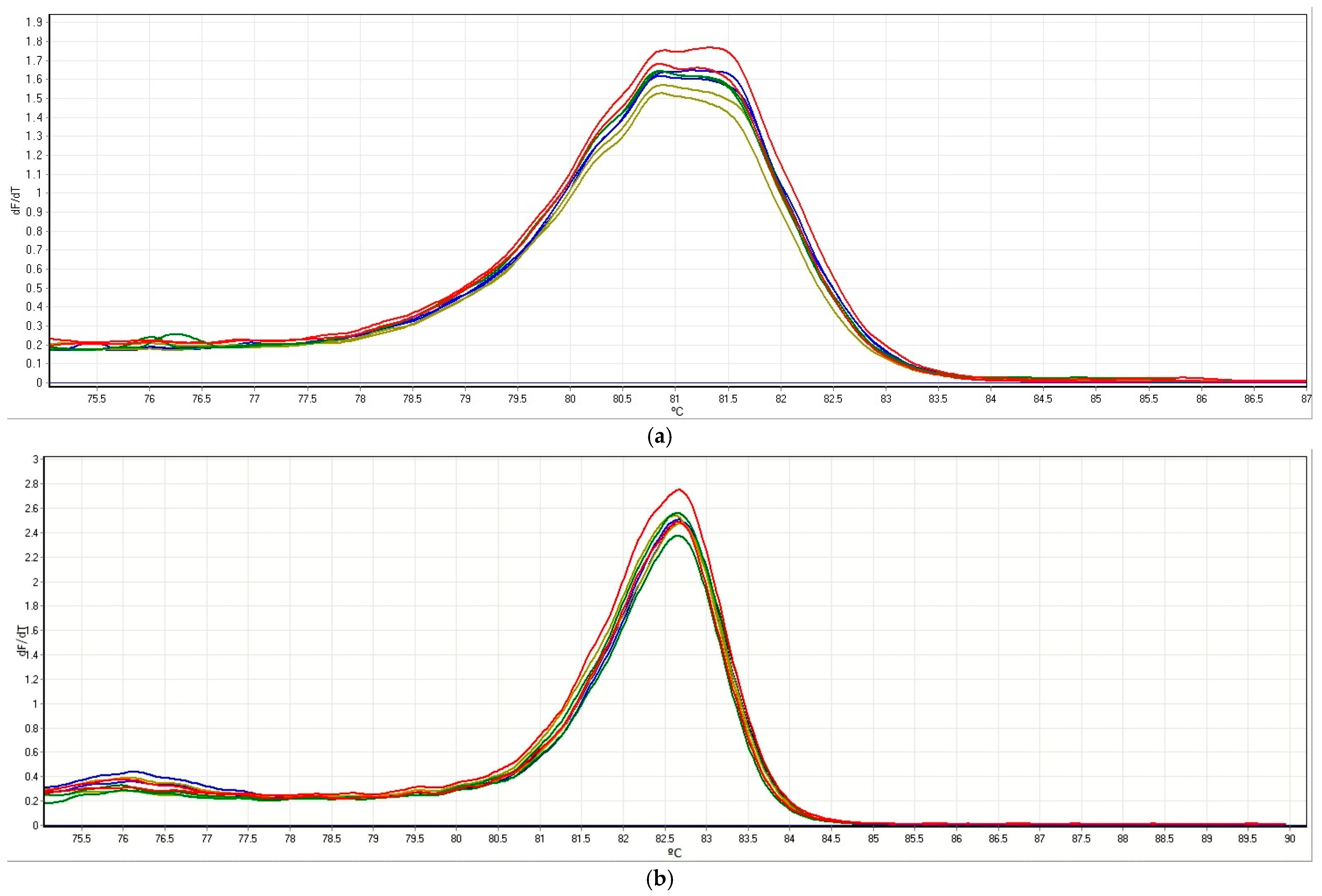 - Reed, G.H.; Wittwer, C.T. Sensitivity and Specificity of Single-Nucleotide Polymorphism Scanning by High-Resolution Melting Analysis. Clin. Chem. 2004, 50, 1748–1754. [Google Scholar] [CrossRef]