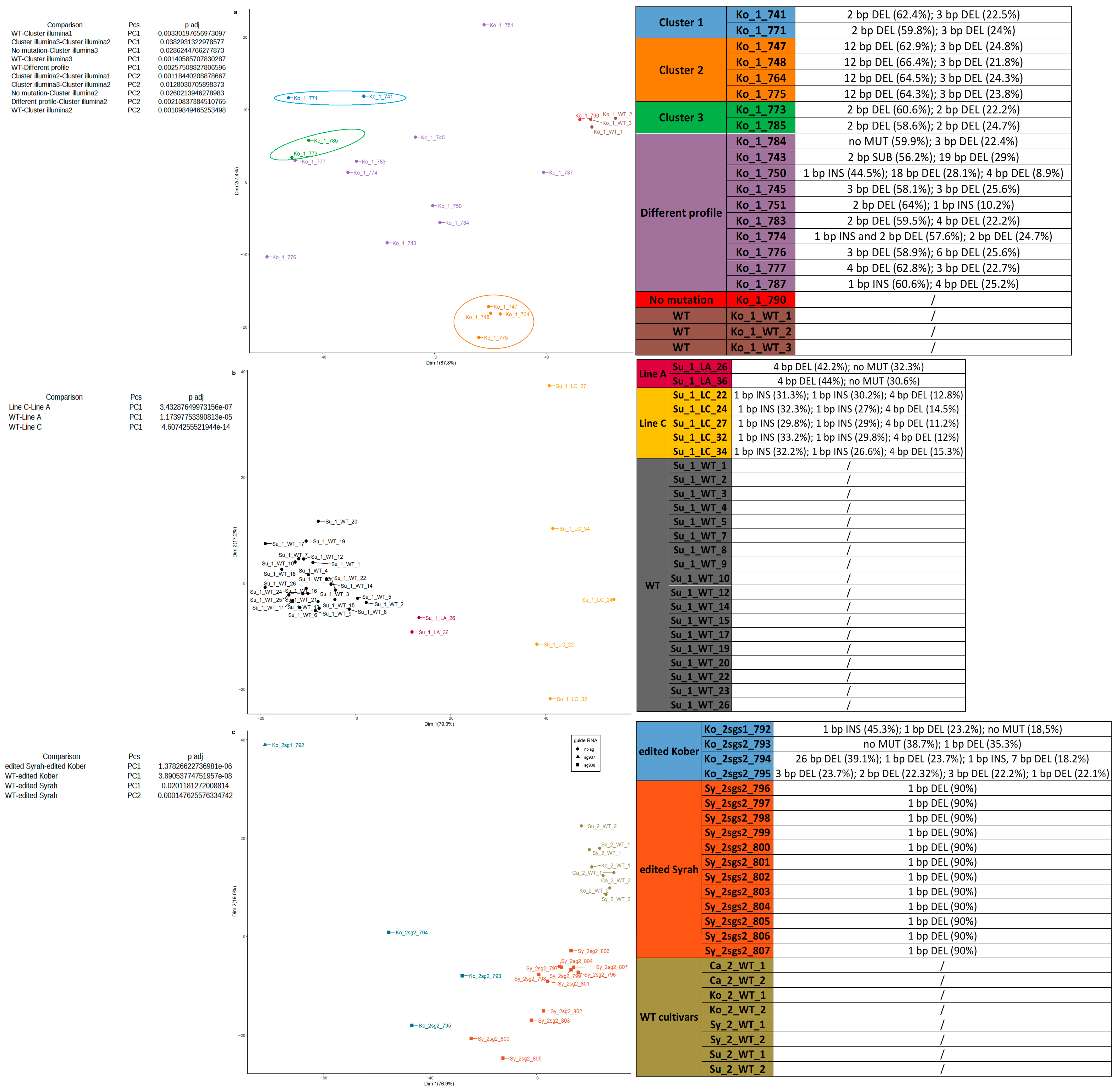 - Dalla Costa, L.; Vinciguerra, D.; Giacomelli, L.; Salvagnin, U.; Piazza, S.; Spinella, K.; Malnoy, M.; Moser, C.; Marchesi, U. Integrated Approach for the Molecular Characterization of Edited Plants Obtained via Agrobacterium Tumefaciens-Mediated Gene Transfer. Eur. Food Res. Technol. 2022, 248, 289–299. [Google Scholar] [CrossRef]