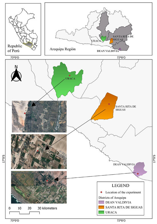 Locations of the experimental sites in the Arequipa Region, southern Peru. Field trials were conducted during the 2024–2025 growing season at three contrasting locations managed by the Arequipa Agricultural Experiment Station (EEA-Arequipa) of the National Institute for Agricultural Innovation (INIA). (i) The Santa Elena Research Center (Uraca District) is highlighted in green, (ii) the Santa Rita Center (Santa Rita de Siguas District) is displayed in orange, and (iii) the San Francisco de Paula Center (Deán Valdivia District) is shown in purple. The satellite images on the left indicate the precise fields where the experimental plots were established.