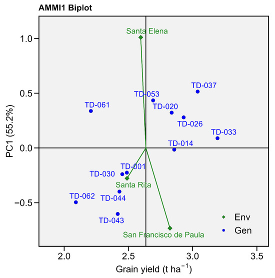 Grain yield for Santa Elena showed positive PC1 scores, indicating that this environment contributed favorably to grain yield expression. Genotypes located near Santa Elena such as TD-061, TD-053, TD-020, and TD-037 displayed values ranging from 2.20 to 3.03 t ha−1, demonstrating a strong genotype–environment interaction affinity.