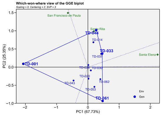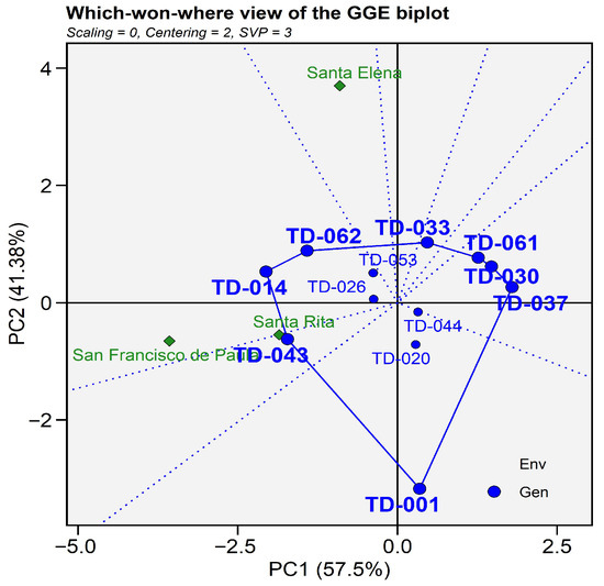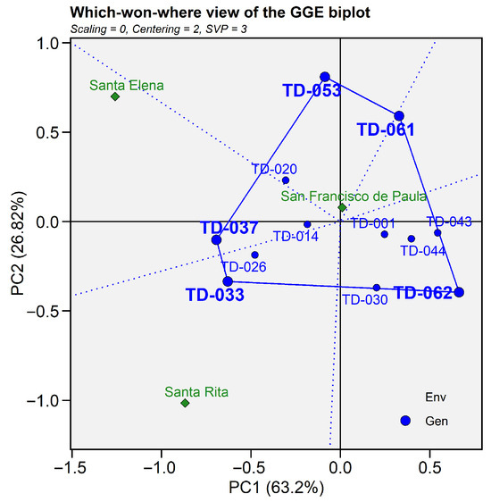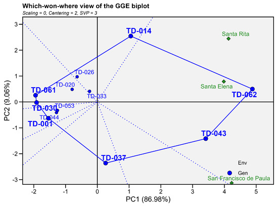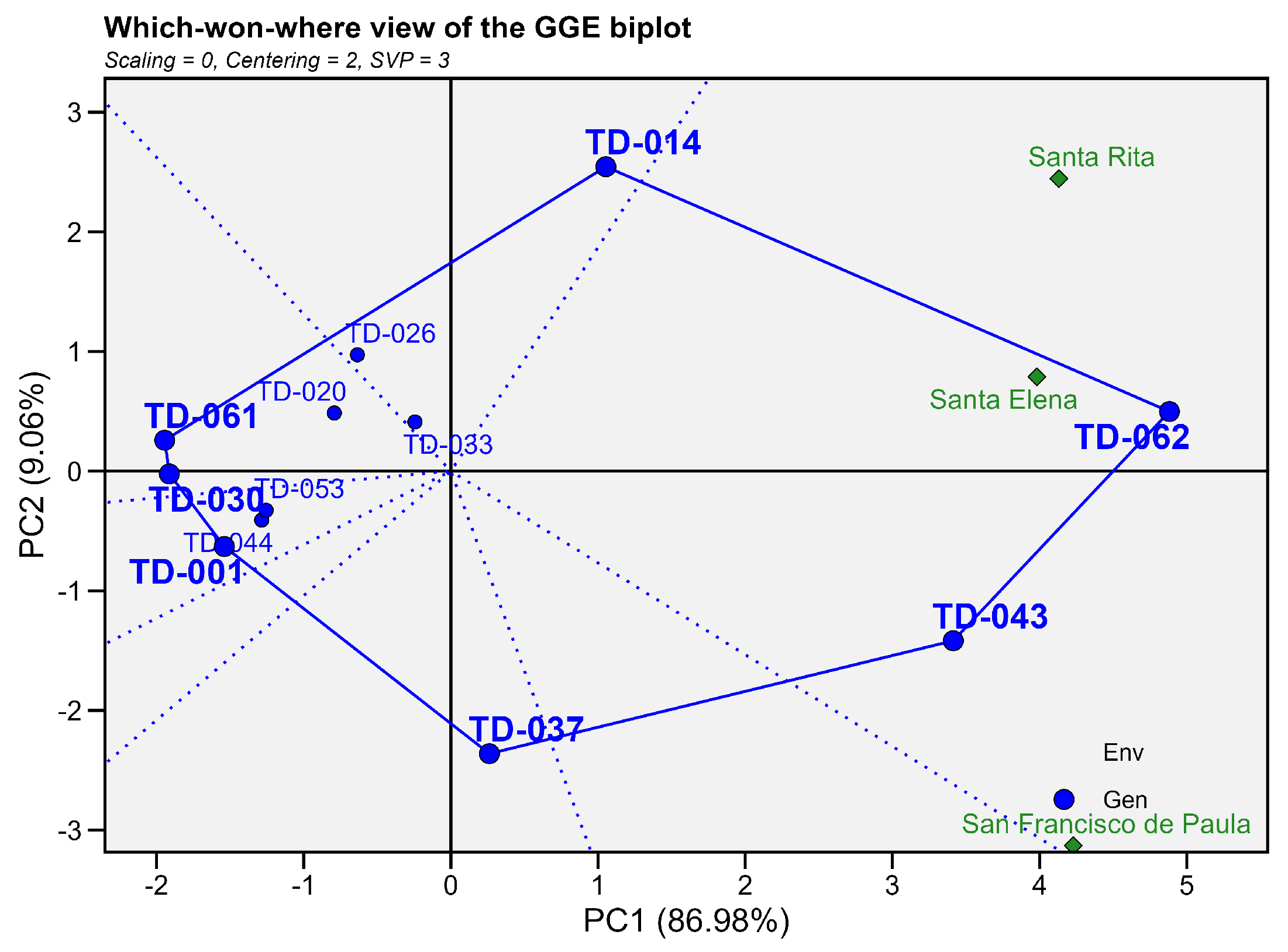 In the “which-won-where” GGE biplot for grain yield (PC1 = 87.88%, PC2 = 8.65%; Cumulative = 96.53), all three environments (Santa Elena, Santa Rita, and San Francisco de Paula) were grouped within the same sector defined by the vertex genotypes TD-062 and TD-043, indicating that these genotypes exhibited superior performance and broad adaptability under the prevailing edaphoclimatic conditions. In particular, TD-062 was associated with Santa Elena and Santa Rita, confirming its high responsiveness and favorable growth in these environments, whereas TD-043 aligned more closely with San Francisco de Paula.