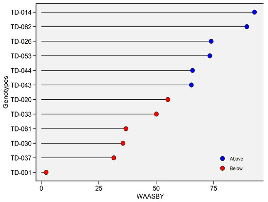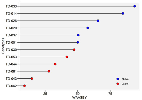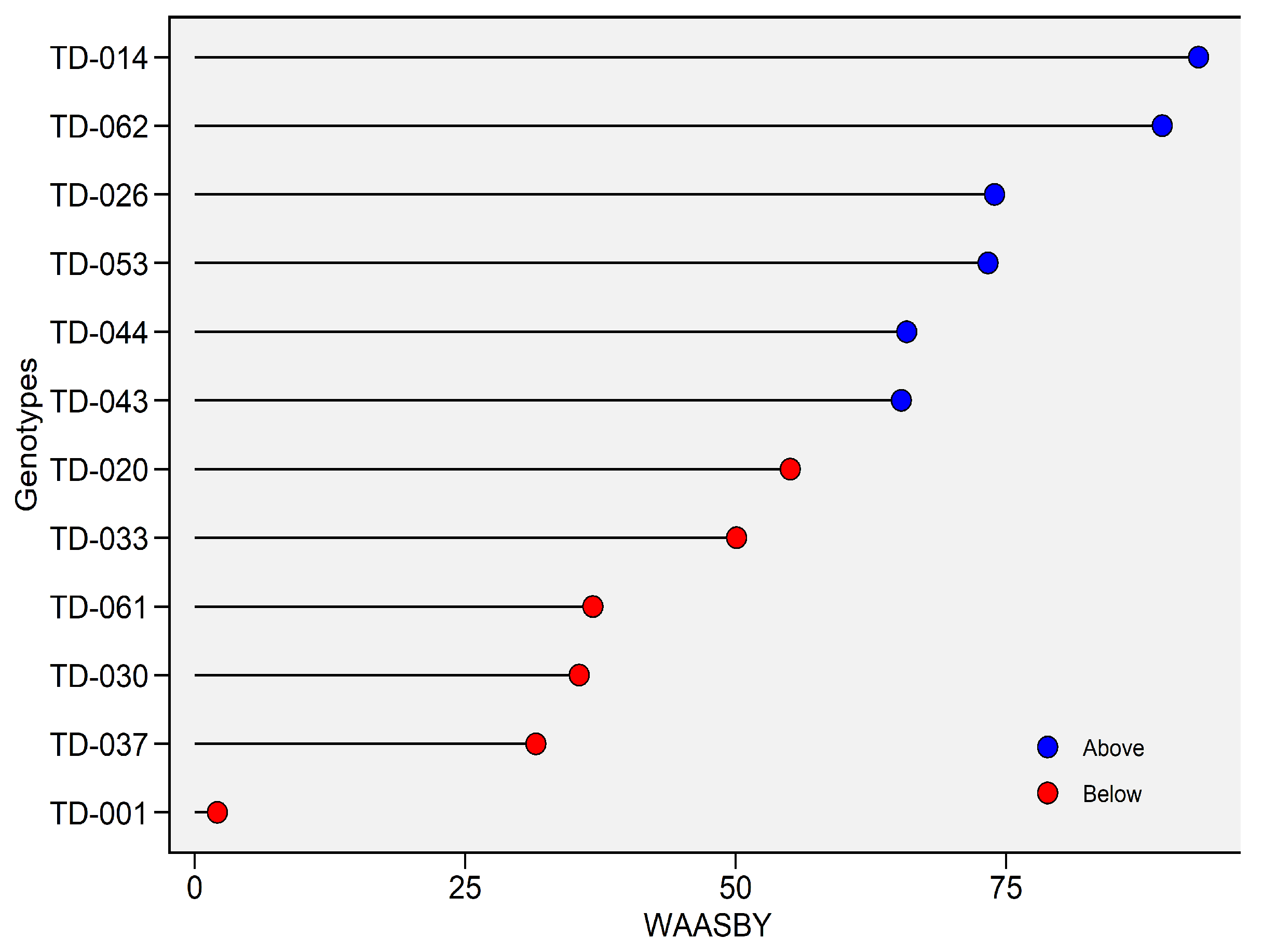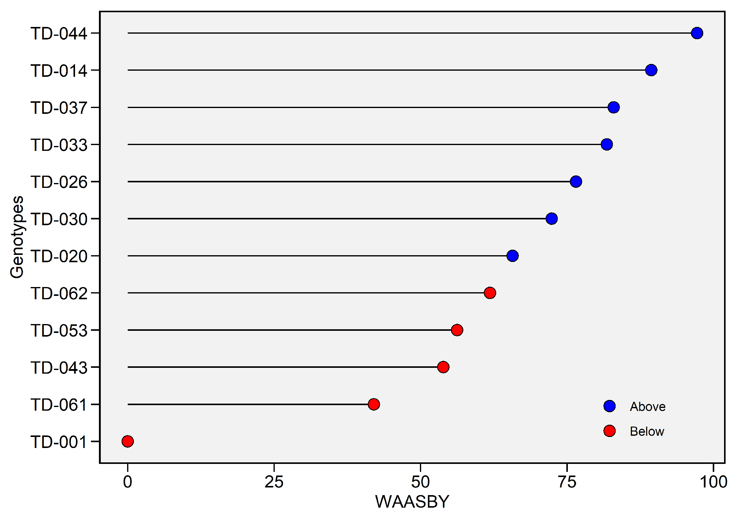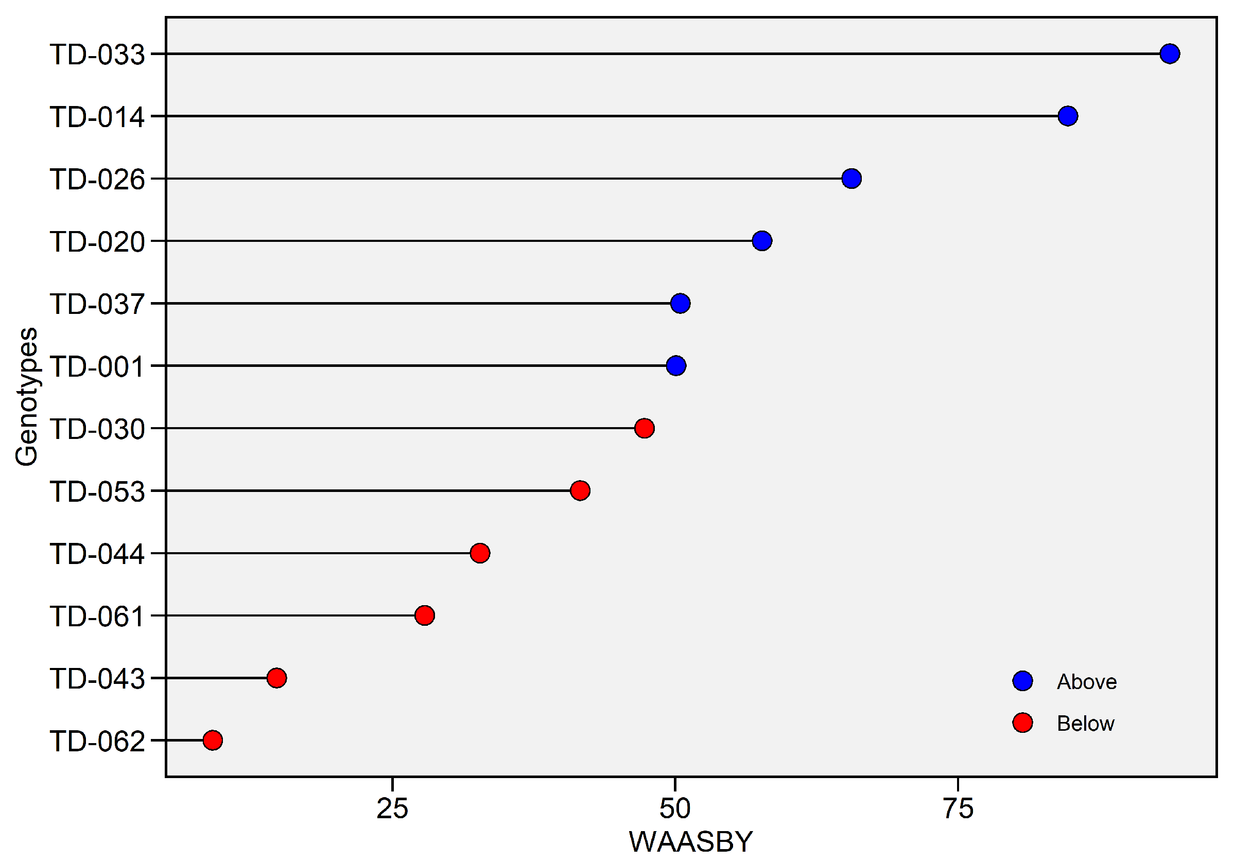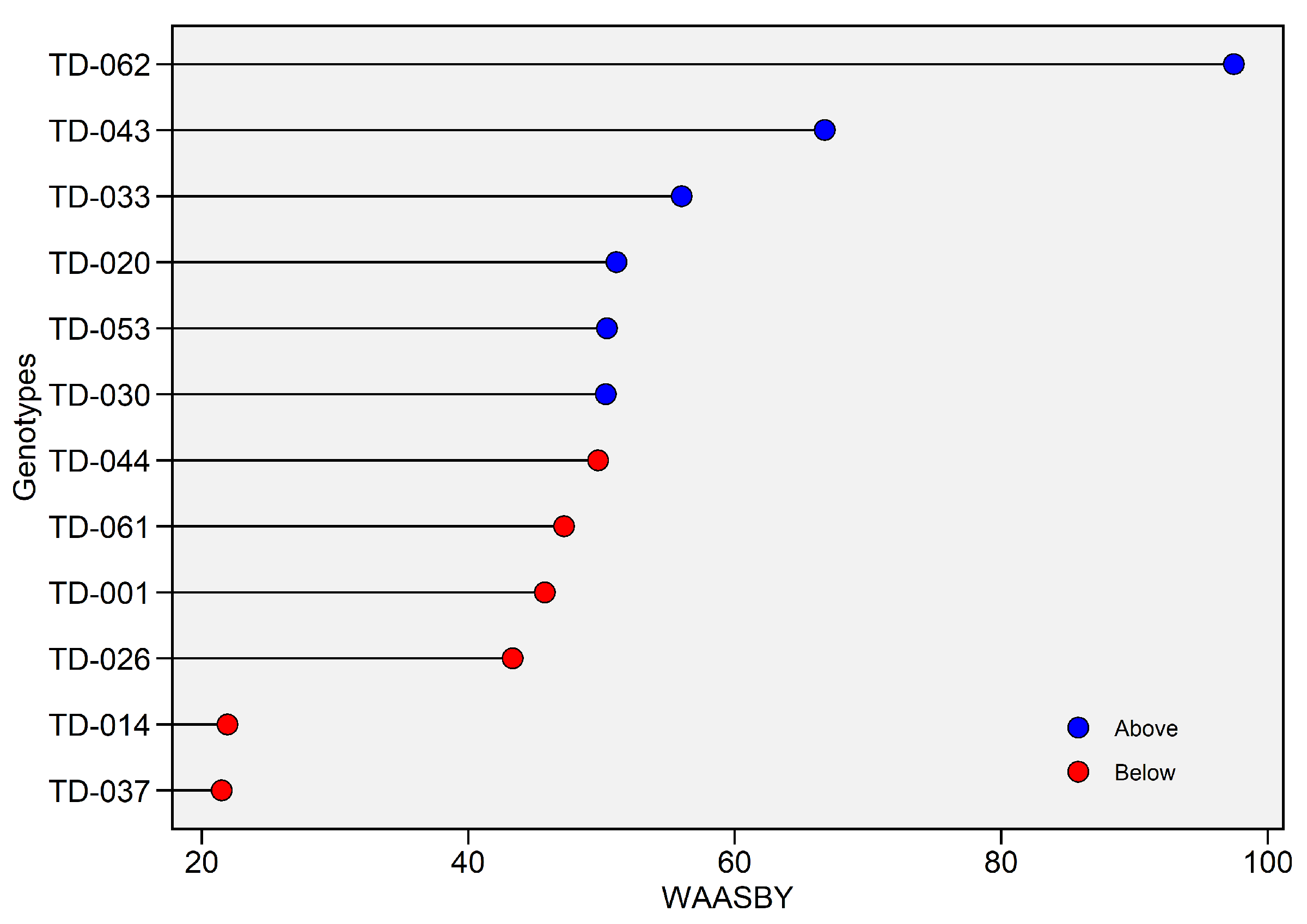 Weighted Average of Absolute Scores and Mean Performance Index (WAASBY), which balances mean performance with stability, clearly discriminated the 12 genotypes (Figure 4). Values ranged from 9.09% (TD-062) to 93.72% (TD-033). Based on WAASBY scores, genotypes above the mean threshold (47.27%) were considered statistically superior in yield–stability performance. Above-average performers (blue dots) includedTD-033, which ranked first, followed by TD-014 (84.72%), TD-026 (65.57%), TD-020 (57.67%), TD-037 (50.45%) and TD-001 (50.07%), all of which combined high grain yield with superior stability, achieving WAASBY values above 50%. Conversely, below-average performers (red dots) included TD-062 (9.09%), TD-043 (14.76%) and TD-061 (27.85%), which showed poor simultaneous performance and stability, whereas TD-053 (41.58%) and TD-044 (32.73%) displayed intermediate performance and stability (Figure 5).