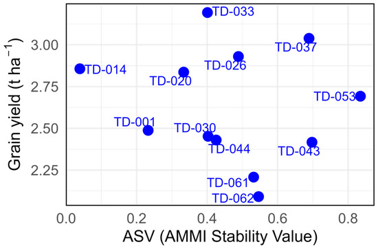 ASV values ranged from 0.03 (TD-014) to 0.83 (TD-053), while grain yield spanned 2.09 t ha−1 (TD-062) to 3.19 t ha−1 (TD-033). In the upper-left quadrant, TD-014 combined the lowest ASV with a yield of 2.85 t ha−1, identifying it as the most broadly adapted and stable genotype, while TD-001 (ASV: 0.23; 2.48 t ha−1) showed a similar but slightly less productive pattern. In the central band, TD-020 (ASV: 0.33; 2.83 t ha−1), TD-026 (ASV: 0.48; 2.90 t ha−1), and TD-033 (ASV: 0.40; 3.19 t ha−1) exhibited high productivity coupled with moderate interaction scores, indicating good but not absolute stability. In the upper-right quadrant, TD-037 (ASV: 0.68; 3.04 t ha−1) and TD-053 (ASV: 0.83; 2.68 t ha−1) achieved high yields at the expense of stability, reflecting greater genotype × environment interaction. Conversely, in the lower-right quadrant, TD-062, TD-061, and TD-043 combined below-average yields (<2.30 t ha−1) with ASV values exceeding 0.50, confirming their limited adaptability and poor agronomic performance (Figure 6).
