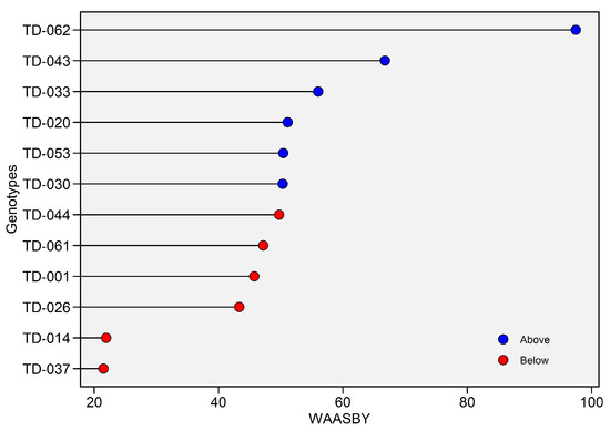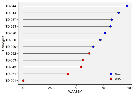 Weighted Average of Absolute Scores and Yield (WAASBY) index for grain yield (t ha−1). The horizontal axis reports the WAASBY value—an integrated measure in which higher scores denote a more desirable combination of grain yield performance and stability—while the vertical axis lists genotypes in descending order of WAASBY. WAASBY values are expressed on a 0–100% scale. Points are colour-coded relative to the overall WAASBY mean (blue = above-average; red = below-average).