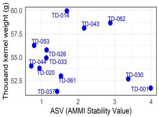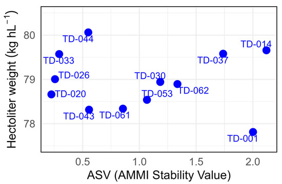 The ASV values indicate 0.29 for genotype TD-033, with a hectoliter weight of 79.57 kg hL−1, which is the most stable with the highest weight, followed by genotypes with a moderate hectoliter weight TD-020 (ASV: 0.22; 78.66 kg hL−1) and TD-026 (ASV: 0.25; 79.00 kg hL −1). These combine intermediate–high hectoliter weight and stability. Genotype TD-044 showed the highest grain hectoliter weight, with 80.06 kg hL−1, and a moderate ASV of 0.55. Likewise, TD-014 exhibited a favourable hectoliter weight of 79.66 kg hL−1, which indicates good grain quality. However, this genotype also recorded the highest AMMI Stability Value (ASV: 2.11). Finally, genotype TD-001 had one of the highest ASVs with 1.95 combined with the lowest hectoliter weight (77.81 kg hL−1), indicating poor stability across environments and low grain quality (Figure 10).