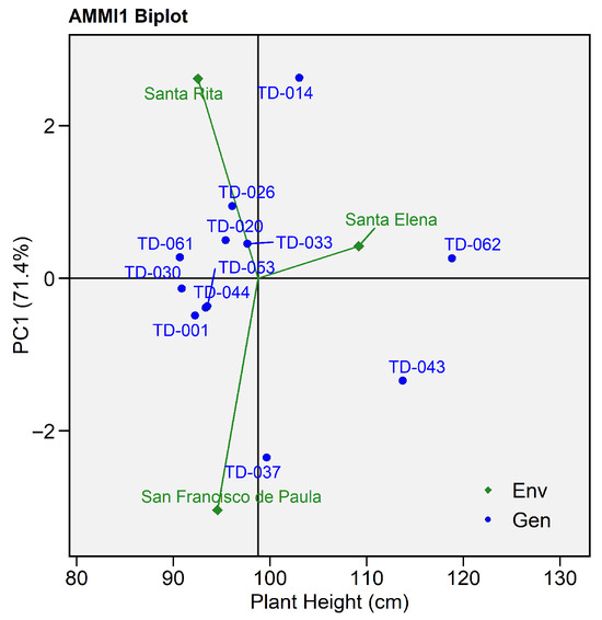 The environment Santa Elena exhibited positive PC1 scores, closely associated with genotypes TD-033 and TD-062, which achieved mean values of 97.65 cm and 118.81 cm, respectively. This pattern indicates that the environmental conditions in Santa Elena favored increased plant height.