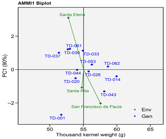 Santa Elena exhibited positive PC1 scores, indicating that this environment contributed positively to the expression of thousand-kernel weight. Genotypes positioned near Santa Elena on the positive PC1 axis (e.g., TD-037, TD-033, TD-030, and TD-061) displayed predicted AMMI values ranging from 51.35 to 52.9 g, suggesting that these lines responded favorably to the specific environmental conditions of this site. Such positioning implies a strong genotype–environment affinity, where the climatic and edaphic factors of Santa Elena favored kernel development and grain filling.
