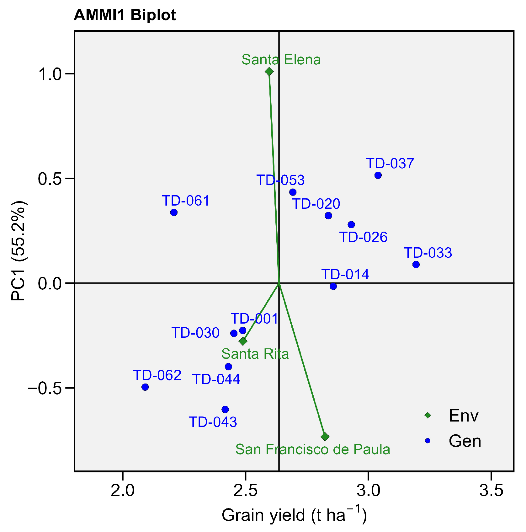Genotypes close to San Francisco de Paula with negative PC1 scores revealed low values for grain yield, ranging from 2.09 t ha−1 (TD-062), 2.41 t ha−1 (TD-043) and 2.43 t ha−1 (TD-044), and moderate residuals (≤±0.6 t ha−1), and they can be considered locally adapted candidates capable of maintaining high grain yield under restrictive environmental conditions.