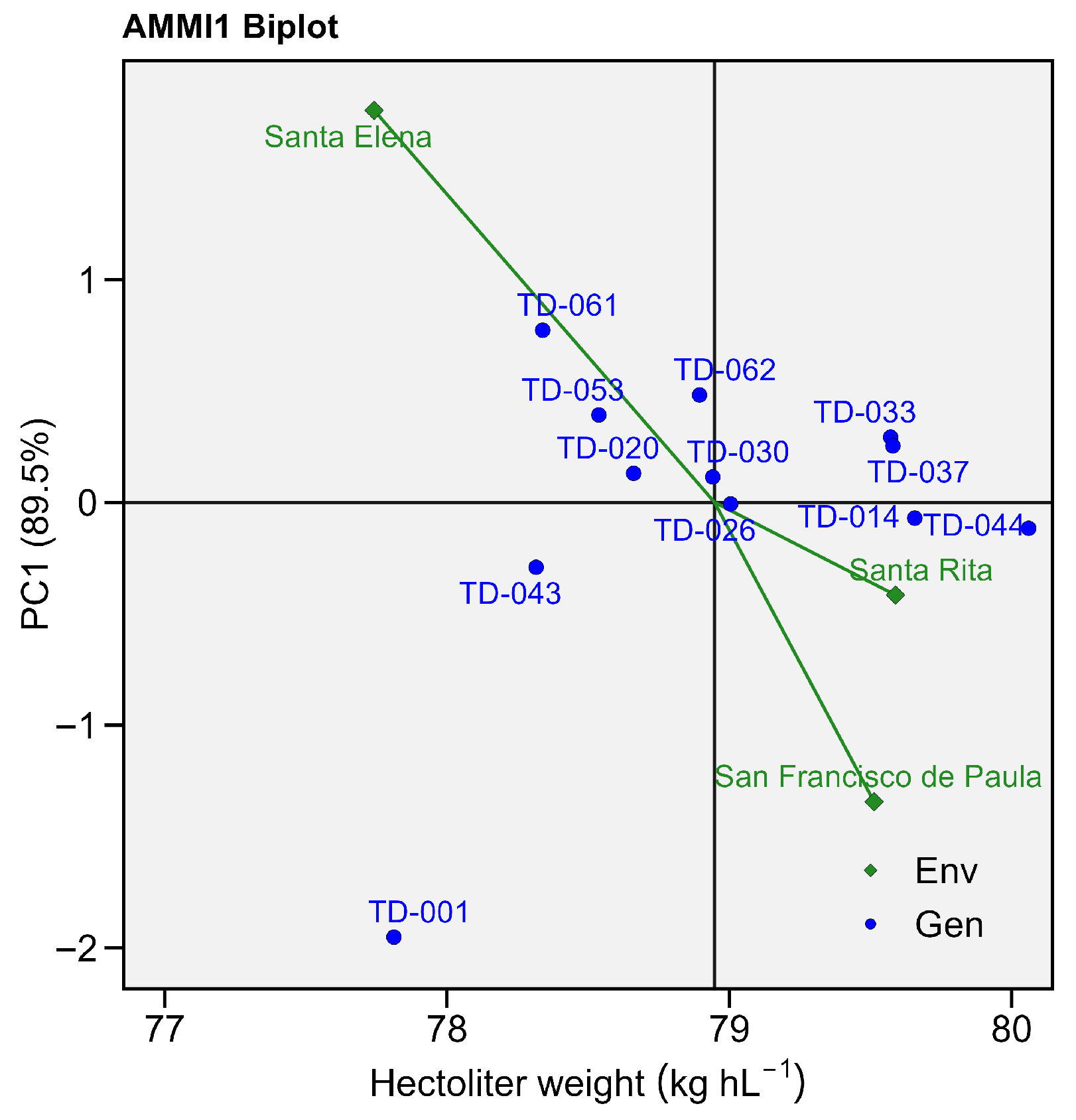 The environment Santa Elena showed positive PC1 scores, indicating a strong positive contribution to electrolyte leakage expression. Genotypes located near Santa Elena, such as TD-061, TD-062 and TD-053, displayed values ranging from 78.33 to 78.89 Kg hL−1. This clustering reflects a positive association between Santa Elena and higher electrolyte leakage driven by local environmental conditions.