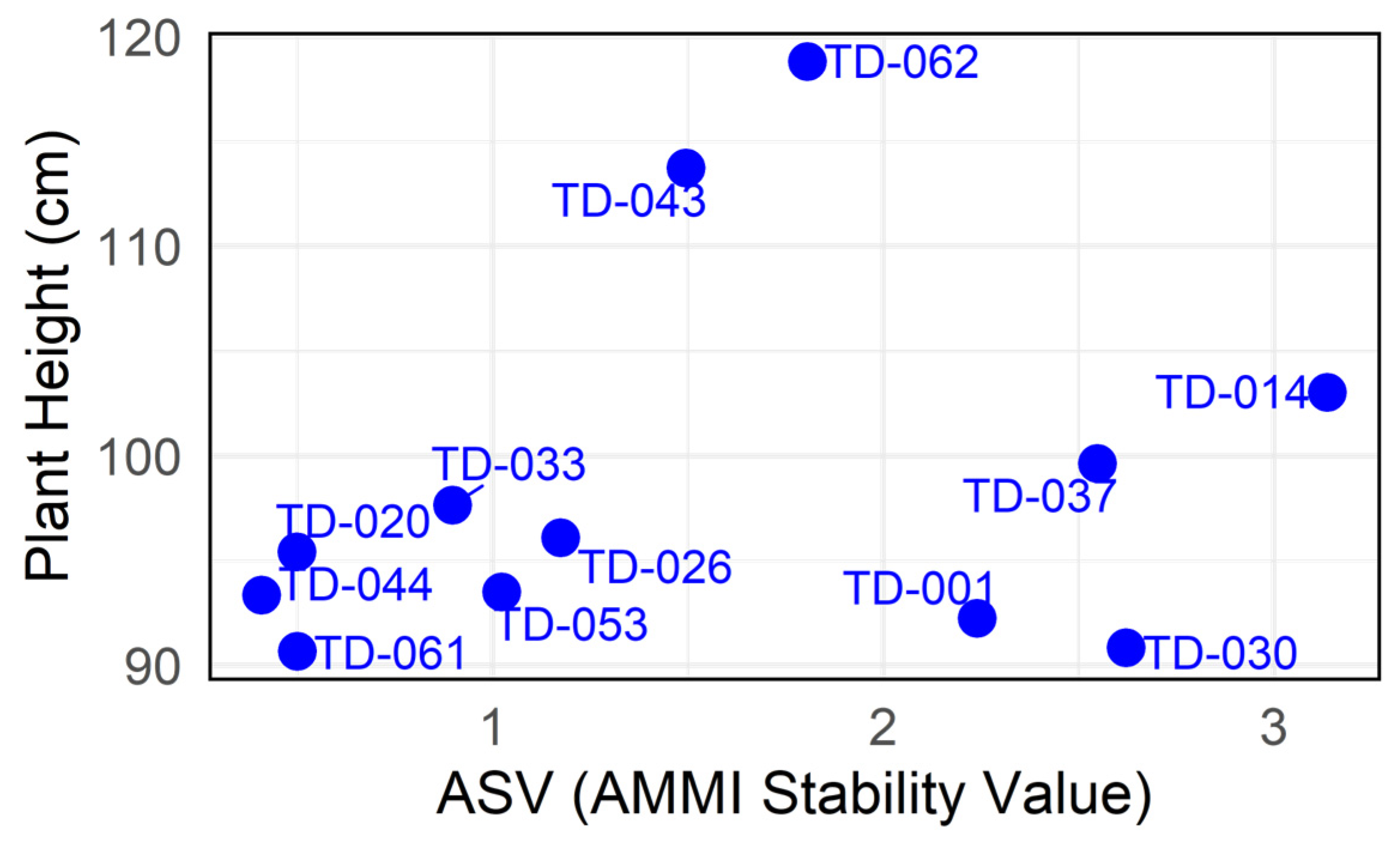 The ASV biplot assessed genotypic stability independently of mean yield. ASV values spanned nearly an order of magnitude, from 0.40 (TD-044) to 3.13 (TD-014), while height ranged from 90.67 cm (TD-061) to 118.82 cm (TD-062). High stability was observed with the lowest height (lower left quadrant). TD-061 achieved the lowest ASV (0.49) at 90.67 cm, marking it as the most adapted genotype. TD-001 (ASV: 2.24; 92.25 cm) followed a similar pattern, but with lower stability. High stability and lower height were observed (lower left quadrant). TD-020 (ASV:0.49; 95.41 cm), TD-044 (ASV: 0.40; 93.35 cm), TD-033, TD-053 (ASV: 1.02; 93.51 cm), and TD-026 (ASV: 1.17; 96.09 cm) offered desirable height and high stability; however, this may have impacted performance. Medium stability and higher height (upper middle quadrant) were observed; TD-043 (ASV: 1.49; 113.73 cm) and TD-062 (ASV: 1.80; 118.81 cm) had low height and lower stability (lower right quadrant). TD-001, TD-037 (ASV: 2.54; 99.65 cm), TD-030 (ASV: 2.62; 90.85 cm) and TD-1 (ASV: 2.24; 92.25 cm) combined below-average heights with high ASV, confirming their poor agronomic prospects (Figure 14).