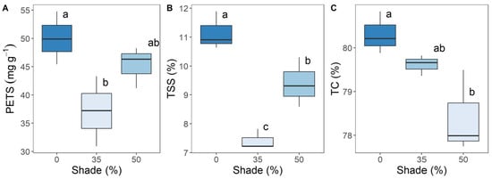 Boxplots of (A) skin total phenolics (PETS), (B) total soluble sugars (TSS), and (C) total carotenoids (TC) of fruits of the red pitaya (H. costaricensis) under three shade levels (0, 35, and 50% of light interception). Boxes represent the interquartile range of the distributions, horizontal dark lines in the middle of the boxes represent the medians, the whiskers represent 1.5 times the interquartile range, and dots represent points outside the extent of 1.5 times the interquartile range. Different letters indicate significant differences between means by Tukey–Kramer HSD test (p < 0.05).
